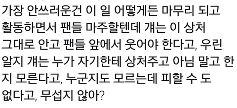 택운이는 이제 나한테서 빅스중에 가장 아픈손가락이될거같아..ㅠㅠ내가 레오로 시작해서 빅스 다 입덕하게됐는데 이번일로인해서 레오 사진이나 영상만보면 짠한 기분이들어..분명 이쁘게.웃고있는사진인데도 보면서 같이웃다가도 그냥 짠해..ㅠㅠ이번에 일터지고 인ㄱ가요 퇴근길에 택우니 뒷좌석에서 불도 꺼져있고 얼굴도 안내보였는데 한 팬분께서 사진밝게해서 찍은거 보니깐 혼자서 별빛들 사랑스러운 눈빛으로 보고있더라..ㅠㅠㅠ데뷔초때에 비해 이제 감정표현 많이하고 웃는모습이나 장난치는모습들도 많이 보여주고있는데 다시 택우니가 예전으로 돌아가버리면 어쩌나...난 그게 너무 걱정돼 ㅠㅠ 잘 이겨내고 자기를 믿어주고 사랑해주는 팬들이 아직 많다는거 알아줬으면 ㅠㅠ그래서 밝은 모습 앞으로도 많이많이 보여줬으면 좋겠다...아 새벽에 너무 두서없이 글쓴거같네 ㅠㅠ그냥 마음이 뒤숭숭해서 여기서라도 글남겨요 ㅠㅠ팬톡별빛들이 편해서..ㅎㅎ
