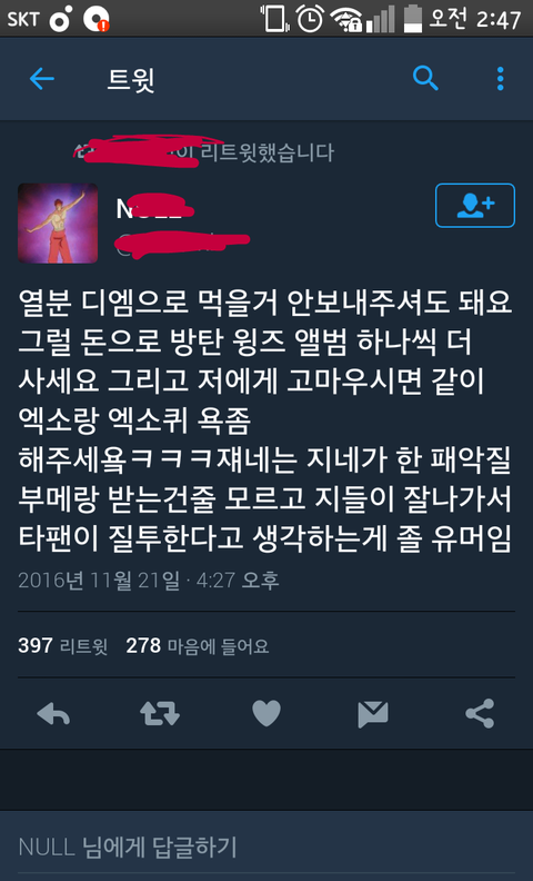 친구가 ㅇㅏ랫1동1네 팬인데 나한테 엑소팬을 욕함(내가 엑소팬인걸 다 알고있음) 그리고 나한테 니 무개념 ㅇㅈ~이러고 이런거 알티함 니넨 어쩔것같냐ㅅ1발