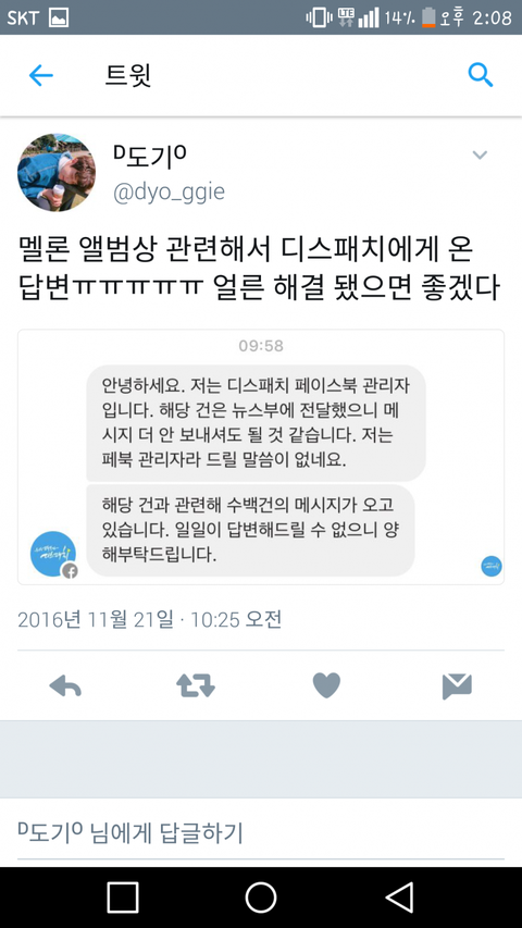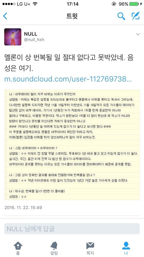이번에 방탄 앨범상으로 판에서 ㅈㄴ 까이는데 도저히 참을수가 없어서 이글 올림. 캡쳐한거랑 음성 올릴테니까 판단은 알아서하고 궁금한건 도대체 문체부나 빌보드 쪽에 문의를 넣는 이유가 뭐임?ㅋㅋㅋㅋㅋ진심으로 궁금해서 그럼 이럴수록 너네 가수 이미지 깎아먹는거라고 생각안함? 지금 며칠째 방탄보고 상 뺏어간 도둑이라느니 상 돌려받으면 상황 끝난다느니 하는데 아니 멜론에서 생각이 있고 방탄이 받을만하다고 생각하고 또 집계가 그렇게 나오니까 상을 줬겠지;; 도대체 언제까지 방탄가지고 물고 늘어질래...? 이제와서 방탄 상받으니까 회사에서 돈썼다고 하는데, 빅히트 전에 스캔땜에 빚더미 앉은거 올해 들어와서 다갚았어ㅋㅋㅋㅋㅋ게다가 빅히트는 직원수가 30명 밖에 안된다...이정도면 그냥 중소도 아니고 크루다 크루...근데 이상황에서 뭔 돈을 썼다느니 사재기를 했다느닠ㅋㅋㅋ추가로 작년꺼 올린건 작년에도 너네 이랬었다고 제발 인정좀 하라고 올린거임
