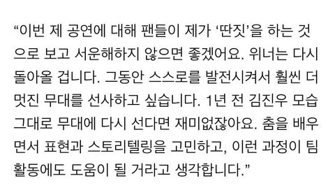 나 인터뷰 올리려고 팬톡에 부랴부랴 왔는데 밑밑 인서가 진우 인터뷰 중심? 젤 중요한 내용 벌써 올렸길래ㅋㅋㅋㅋ난 그냥 풀로 올리고 갈게