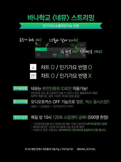 네이버뮤직 매일 오후10시에 무료이용권 뿌려지는거알지 대기타다가 받아 그리고 친규한테80곡들을수있는거줄수도있고 10명한테주면 다운로드권도 준다더라!