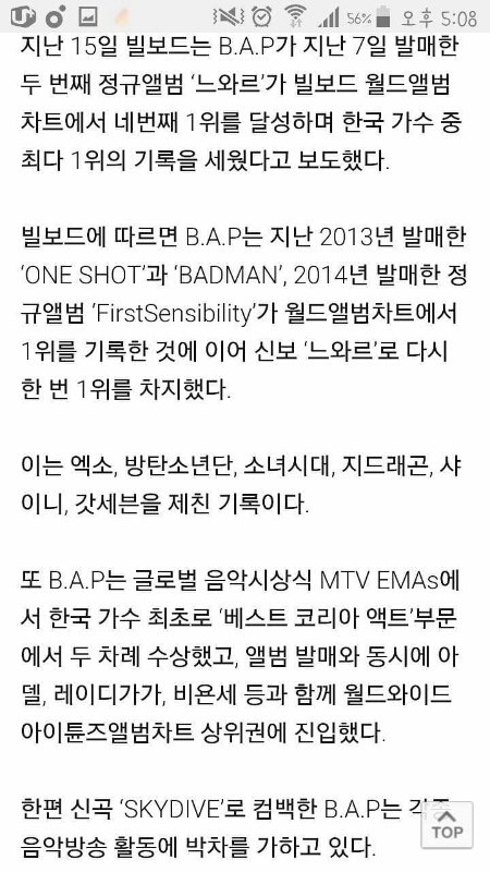 사실상 머글인데 기사 보다가 쫌 놀랬음. 비에이피 한국에선 인기 많은 편이 아니라 진짜 코어층 즉 매니아층만 깊이 있다고 들었는데 해외에선 인기가 ㅎㄷㄷ.. 물론 기사에 언급된 가수분들 다 훌륭하지만 의외랄까나. 이번에 스카이다이브 활동 하던데 잘되길~~