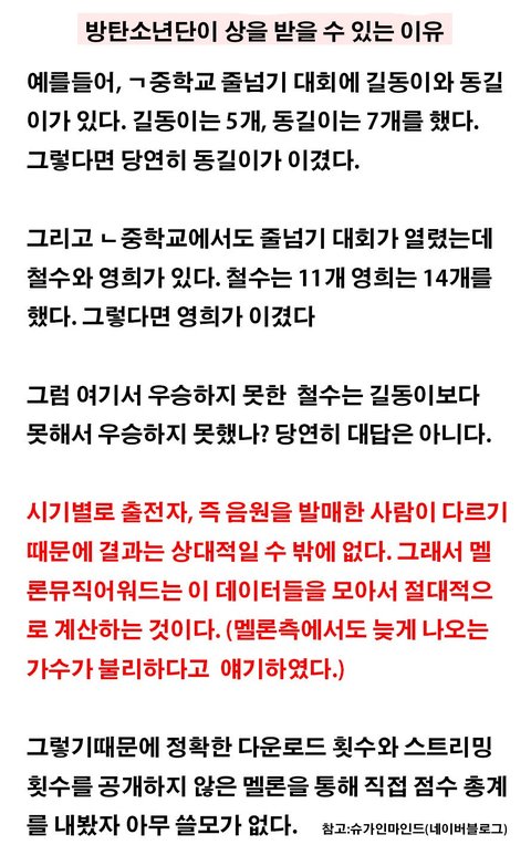 후 내가 쓰고 싶은 말이 여기있네 동길이 영희도 둘다 이긴 1등인건 똑같지만, 누가 1등이냐에 상관없이 순수 줄넘기 개수만 따지면 14개인 영희가 더 많이 한 것임. 따라서 니네가 아무리 차트 순위 1등이라고 빽 거려도 1등이라고 음원이 많이 팔렸다고 단정할 수 없고 차트순위가 낮다고 안 팔린 음원도 아니라는거야 ^^ 이거에 대한 기본 이해가 없으니 순위가지고 백날 늘어지겠지.....
