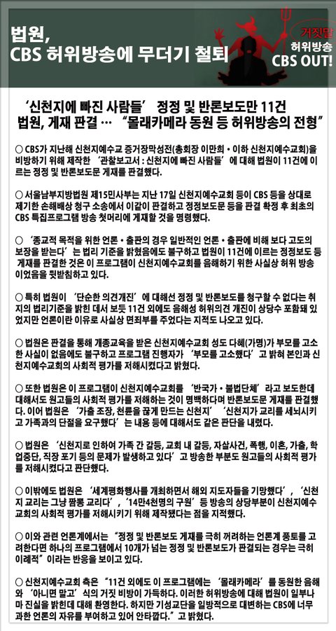 법원,CBS거짓방송에 정정반론보도 및 손해배상하라!