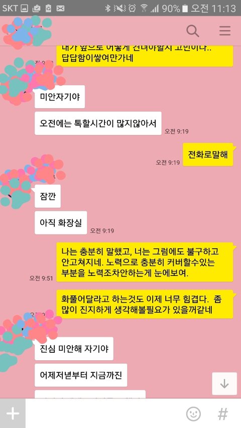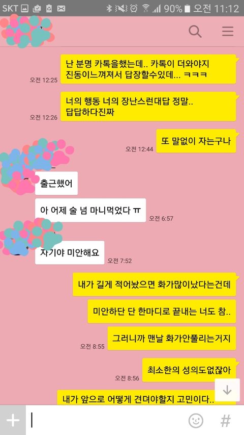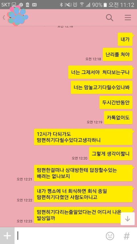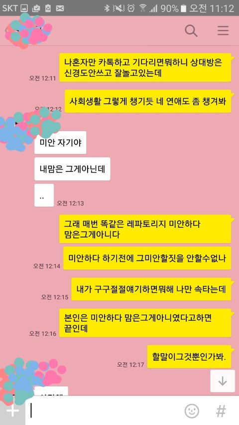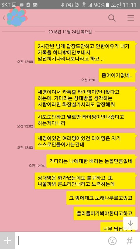 너무 어이가없어서 너는 두시간 동안 화장실갈 시간도없었냐, 자정이다되가도록 연락한통없는데 편히기다릴수있겠냐, 카톡을 여러개 보내지않아 확인 못했다는 뚱딴지같은소리 마라 하니 제앞에서 노래를 흥얼거리더군요