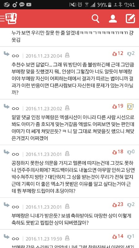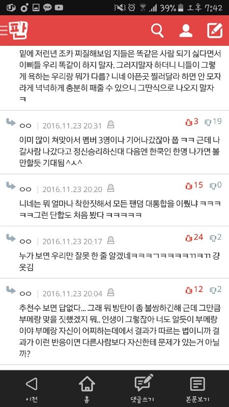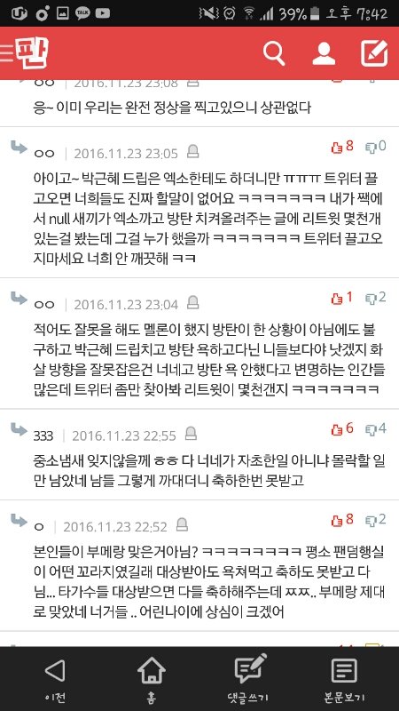 아니ㅋㅋㅋㅋㅋㅋㅋ추천수 너무 소름돋고..막 우리가 평소에 행실이 어땠기에 뭐..ㅇㅈㄹ하는데 ㅋㅋㅋㅋㅋㅋㅋㅋㅋㅋ아 우리는 저쪽이랑 상대도 하기싫고 우리는 우리끼리 행복하랴