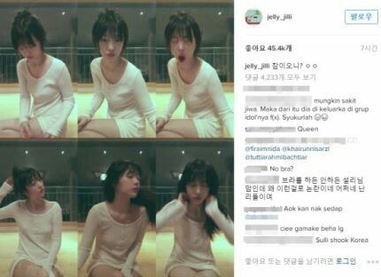 사진 아래에는 만 하루도 채 되지 않아 수천건의 댓글이 달렸다. 댓글에는 “공인으로서 부적절하다” “이쯤 되면 관심종자?” “논란을 즐기는 듯” 등의 비판과 “노브라가 어떻게 논란거리가 되나” “개인적으로 올린 건데 뭐가 문제냐?”는 옹호 의견이 팽팽하게 맞섰다.