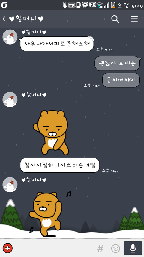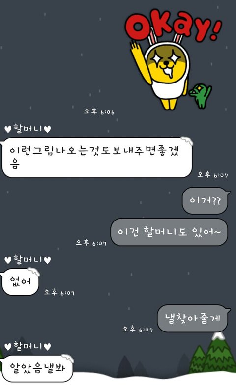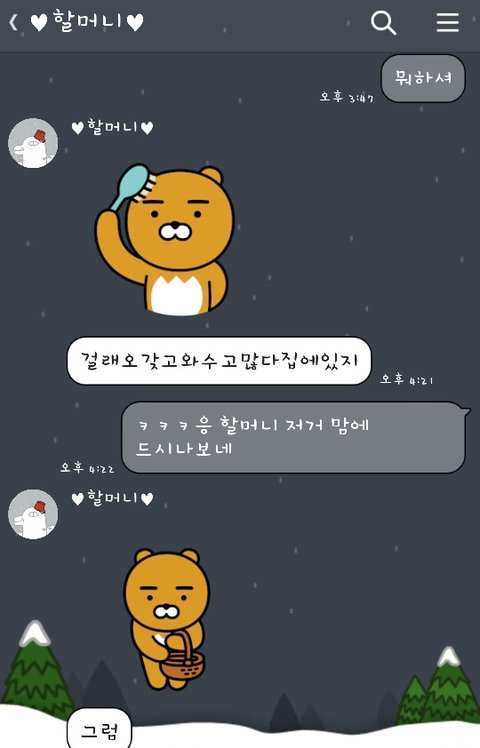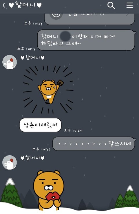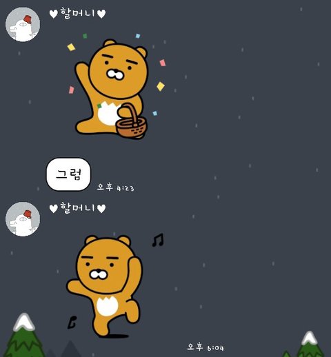 요즘에 라이언 이모티콘 많이들 쓰잖아요~그래서할머니에게 선물해 드렸더니 너무 좋아하시면서 잘쓰시네요 헤헿ㅇㅁㅇ/ 제가 집에 못가는 날에 선물한거라 삼촌이 등록해서 쓰실 수 있게 해드렸나봐요.ㅋㅋㅋ그와중에 이모티콘 너무 귀여워여..