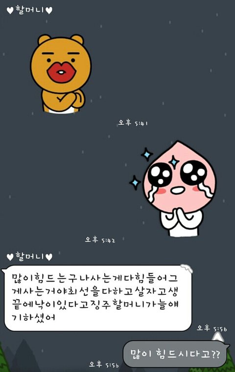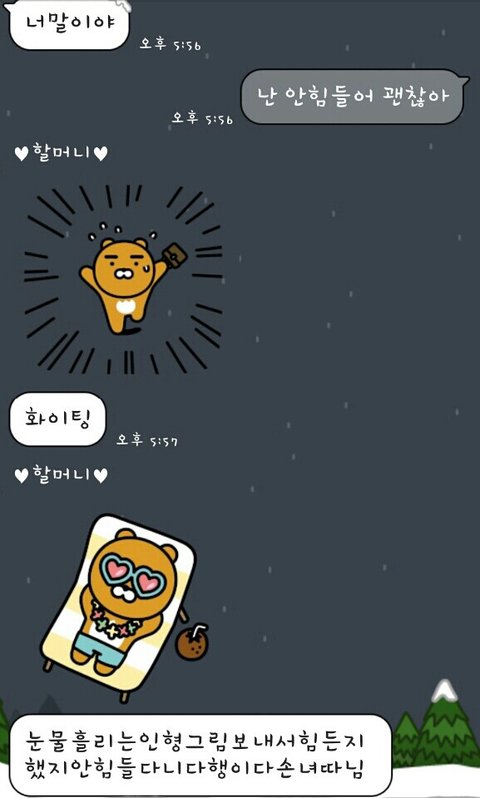 할머니가 이모티콘을 너무 잘쓰시길래감격해서 눈물흘리는 어피치 이모티콘을 보냈더니우는이모티콘보시고 제가 힘든줄 아셨나봐요.ㅋㅋㅋㅋ 뜻밖의 위로에 ㅋㅋㅋ감동받았습니당..이모티콘이란 단어를 모르셔서 인형이라고 하세요..ㅋㅋㅋㅋㅋ