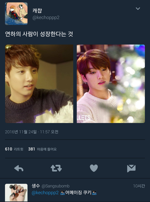 후 원래 다 오빠였는데 슬슬 나보다 어린친구들이 데뷔를 하다니 딱히 어린나인 아니지만 정국이보단 어려서 다행이다 평생의 본진만 오빠면돼 오빠☆..근데 연하면 어떤기분일까 상상만해도 설렘