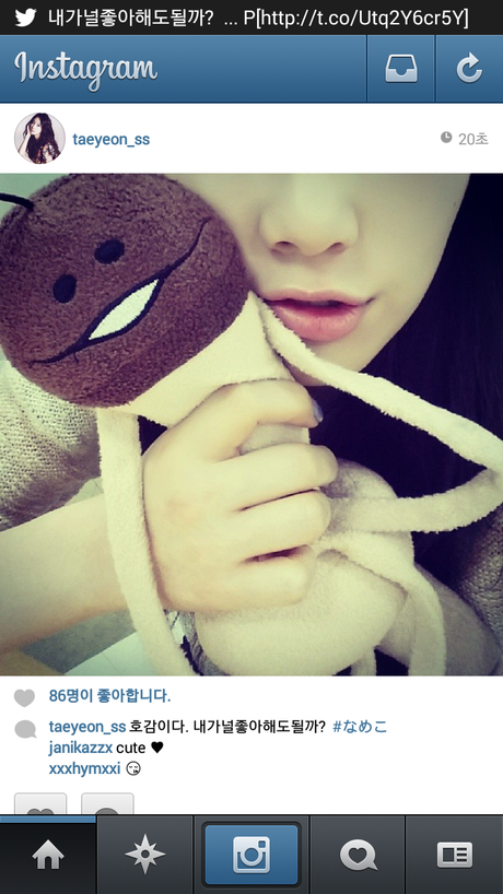 탱큥이 사귈 즈음 태연이 인스타에 "내가 널 좋아해도 될까?" 라며 올린 인형