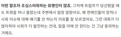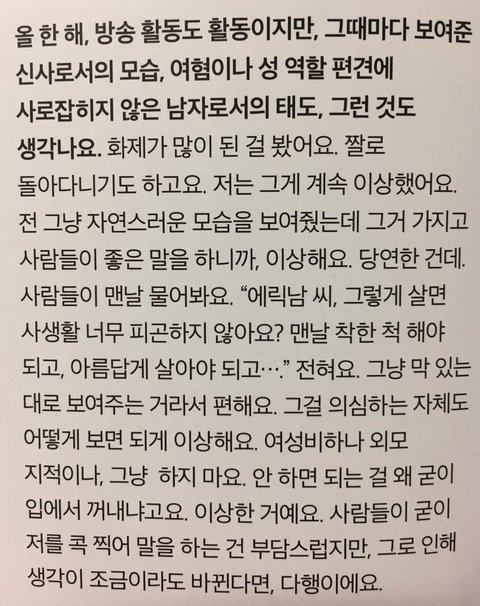 인터뷰가 너무 충격적으로 좋아서 다른 인터뷰 찾아보다가 에릭남씨 트럼프 당선됐을때 역겹다고 트위터 남긴것도 의외였지만, 이 인터뷰 되게 와닿네요. 제가 우리나라 최초 여성부를 만든 김대중 전대통령을 존경해서 자서전을 많이 읽는편인데 항상 강조하신게 중립은 악의 축이고, 행동하는 양심이 돼야 한다며 말 한마디라도 표현을 해야 사회가 바뀔 수 있다고 하는데 에릭남씨 말도 확 와닿네요!