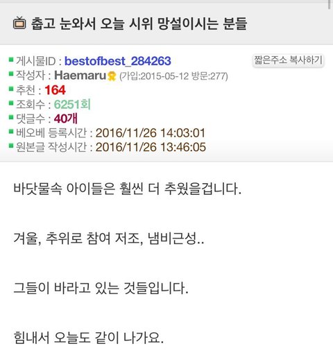 8시부터 1분동안 불끄기 참여한사람 몇명이나 될까.. 비록 시위에 참여하진 못했지만 불끄기 운동이라도 참여해서 다행이다 !!!! 시위참여하시는분들 힘내세요 응원하겠습니다. 눈발이 촛불에 녹길....."