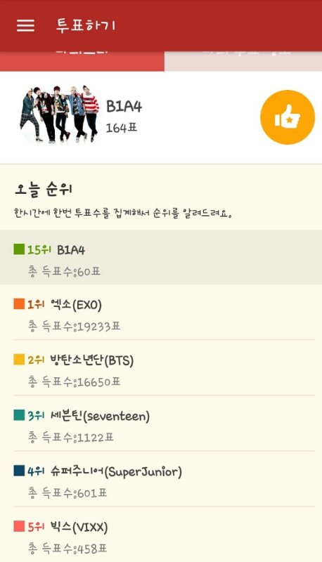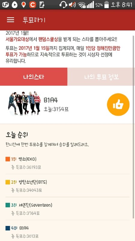 팬덤스쿨에들어가서 비원에이포를 투표해주세요 이 투표가 100퍼센트 상을 결정합니다!어제보다 오늘 3000표이상을 얻었어요 지금 바나 화력이 최고입니당♥힘들겠지만 2017년 1월 15일인만큼 열심히해요!(들어가보년 마이페이지에서 상자보관함에들어가면 오렌지 상자라고 있는데 매일 4개인가 5개씩 충전되서 열수있습니다 매일 투표6개가 가능하니 많이 해주세요!)