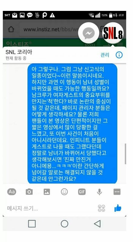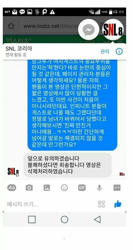 근데 이일이 처음이아니야 인피니트분들한테도 그랬었어 인피니트영상에서는 이제 다만졌다 이런 얘기도 들려 지금 snl페북에 페메 하면