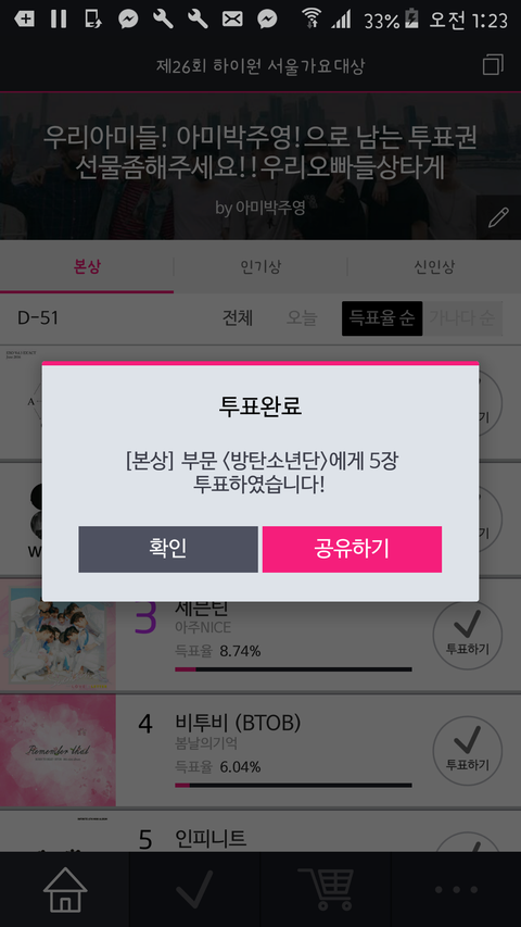 아미분들 요즘 여러모로 힘드실텐데 화이팅하세요 신인 투표하다가 본상도 투표해봤습니다 서가대는 진짜 파이가 커질수록 날이 갈수록 잡기 힘들잖아요 장기전인데 끝까지 화력 유지하길 바래요~