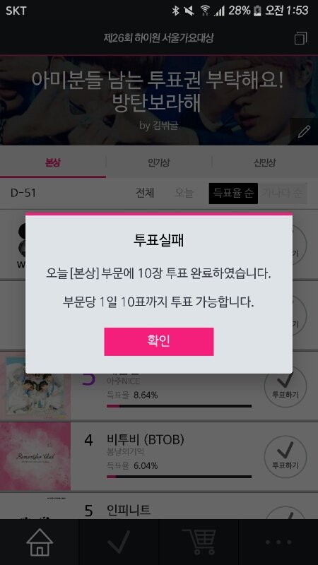 어제 10표 다 투표하고 12시 지나서 오늘 다시 투표하려는데 이렇게 떠..