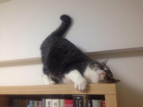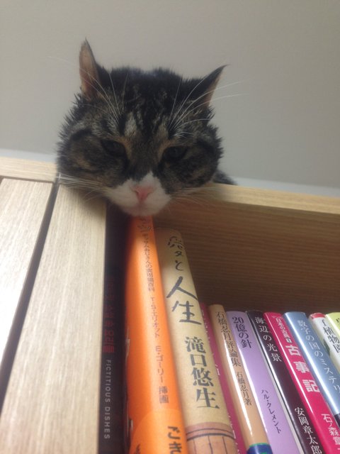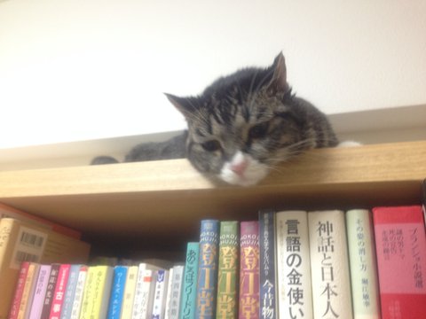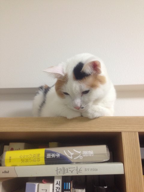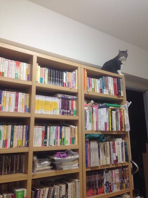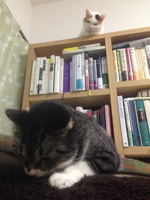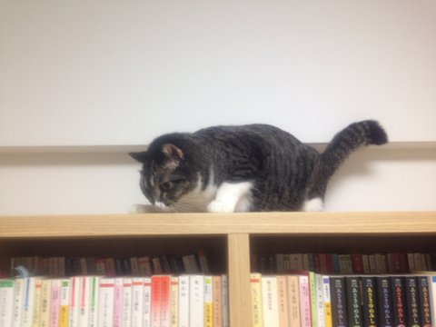 책장 위로 올라오지 못하는 나나코를 측은해하고 있는 모양입니다.