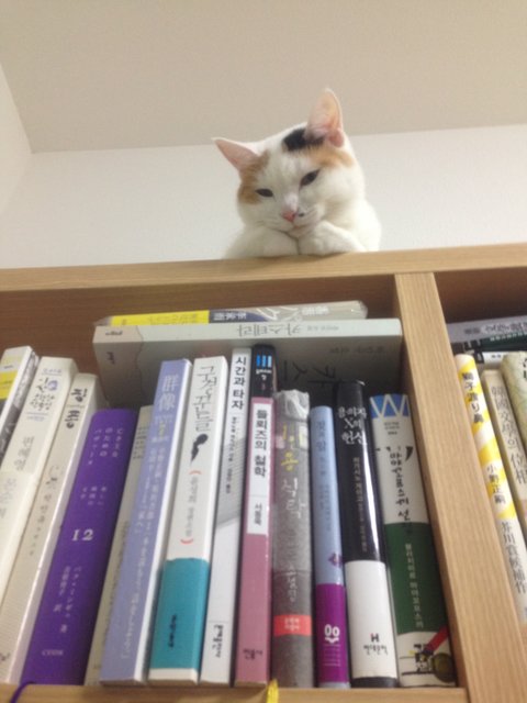 오늘도 책장 위를 차지한 퐁타