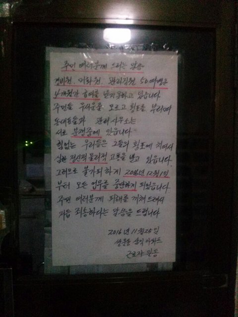 최근에 이사를 했습니다. 이사온 지 며칠 뒤에 아파트 경비실에 이런 벽보가 붙어 있네요. 관리사무소의 횡포로 경비아저씨들과 청소하시는 아주머니와 아파트 관리직원들 50여분께서 4달간 월급을 못 받고 계시대요.