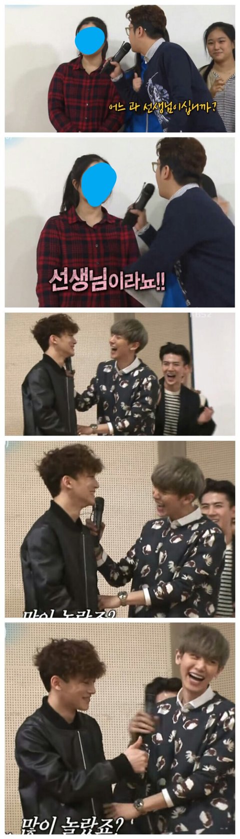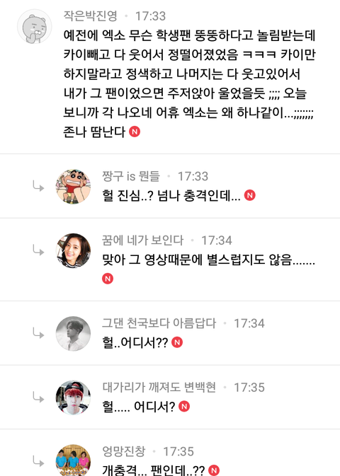 누군가가 엑소 팬보고 뚱뚱하다, 얼평 드립했는데 박장대소 하는 엑소 여자 팬들 얼평하는데 세훈 찬열 첸이 같이 서로 보면서 웃기다는듯이 웃음 오죽하면 카이가 말릴정도.. 까도까도 나오는 엑소 양파세요?!??
