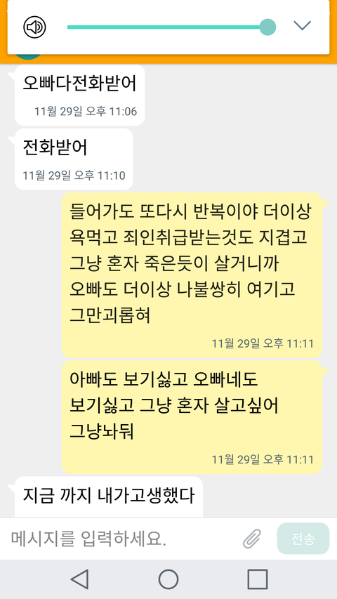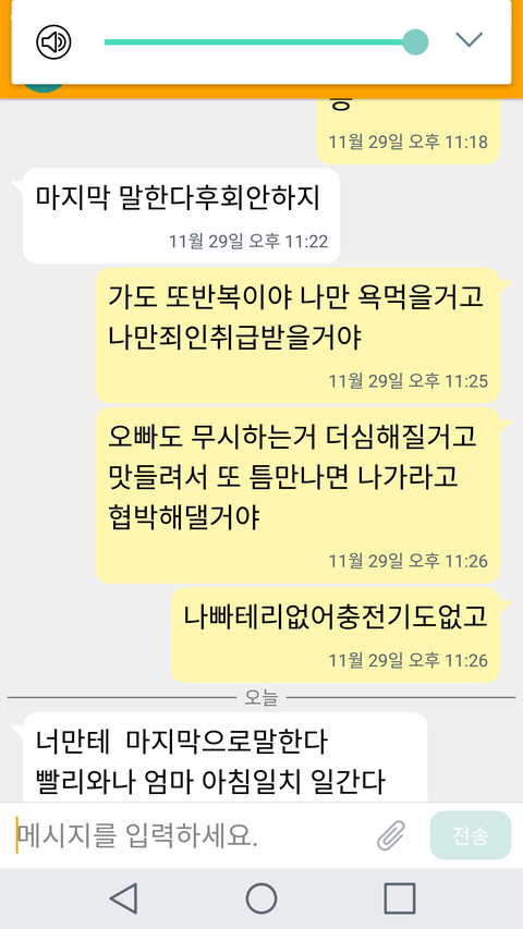 그래서 내일부터 다시 돌릴게 근데 나 청소기도돌리고 __질도했어(방세개의 거실까지 딸린 집) 그러자 청소기를 한번만 돌리냐 두번세번돌리는게 그렇게 귀찮냐 넌 그래서 안된다 등등,너무 서럽고 난 했는데 저렇게 까지 말했어야 하나 그냥 너 힘든거아는데조금만더 깔끔하게 하자 라고 좋게 말해줘도 알아듣거늘,,,, 그래서 나도 하루종일 애기 놀아주고기저귀갈아주고 애기 옷하고 가제손수건은 하루에 몇장씩이나 나와서 그거 빨래하고 오빠 일갔다온 옷 세탁기돌리고 하다봄 나도 정신이 없다.   그러자 니가 내 밥을 차려주냐 뭘 하냐 애기핑계그만둬라 아 ~그럼 너가 다 청소못한게 유민이 때문이네?라며 비꼬더라구요   참고로 오빠하고 나는 동거 부터 시작했는데 멋모르고 어른들의 이끌림에 동거란 개념자체를모르고 시작했어요 . 그러다가 제가 요리를 했는데 맛이 별로였나봐요 그뒤로 뭘 하던 먹지않더라구요 유부초밥도 나름해보고 된장찌개 계란장조림 맞아요 손재주 없어요..그래도 먹는시늉이라도 해주고 이건이점이부족하다 그러면서 말해주면 그래도 할맛나잖아요  이게 찌개냐고 국이지 하면서 끝까지 끝까지 한숟갈먹고 안먹더라구요?그뒤로 혼자서 어머니네서 챙겨먹고와요  저는 대강 계란에다가 먹구요 . 요리할맛도 안나고 혼자먹는데 뭐해먹기엔 돈도많이들구요  그러다가 오늘 또 터졌네요 오자마자 컴퓨터방으로 가서 게임을 하더라구요 . 솔직히 애기조금보고 (분유몇번먹여본게다임)헤드셋 끼고 타자 투닥투닥 울리는 오디션 하는데 타자소리 짜증나서 문닫고하라고 여러번 말했어요. 근데 헤드셋은 벗지도  않고 계속 어?어 ? 이러더라구요 자려구 누워있던 참에 일어나서 방가서 문닫고하라고 하니까 알았대요 근데 끝까지 헤드셋끼고 게임만하고 있어요열이받아요 안받아요??  짜증나서 안방 (자기꼴릴때자고 아닐땐컴퓨터방에서 자서)에서 자려고 누웠는데 컴퓨터 끄고선 안방으로 와서불키고 티비키고선  넌 뭐가 그렇게 불만이야 왜승질이냐 그래서  아니 여러번 말했는데 끝까지 문안닫고 어어?그러니까 열받지안열받아 ? 그러니까 문사이틈에 밥솥코드가 있어서 문못닫은거래서  그럼그렇게 말해야지 알았다해놓고서 안닫으니 내가 알아?나자게 그만불끄고 나가줘 (오늘낮에 오늘도 그방에서 잘거냐니까 그렇다함) 그랫더니 니가 뭔데 이래라 저래라야 이러는 거임  그래서 아니 저방에서 잔다며 그니까 나가달라고 니가 뭔데 명령질이야 내가 왜 니말을 들어야하는데 끝까지 이말만 반복 열받아서 이불 들고 내가 컴퓨터방으로 가서 자려고 이불깔고있는데 와서는  너 나가 제발 나가 너랑같이 살기싫다. 니가안나가면 니스스로 나가게끔 만들어줄테니까 각오해 열받아서 짐싸서 그래 나가줄게 나가주면 될거아냐 고래고래 소리지르고 짐싸니까 지 엄마한테 전화해서는 얘나간다고 짐싼다고 엄마말대로 얘정신장애있는거맞다고 얼른오라면서 장난아니라고 얘진짜 나간다고 .  그래서 아니 내가나간다는데 왜 어머니는 불러   그러니까 왜 쫄려?쫄리나보지? 기다려 넌 엄마한테 다 말해서 내보낼테니까  (오빠가월 200벌어요 그중오빠 핸드폰비 50나오고 저도 만만치않게 2~30나옵니다 맞아요 철없죠...거기다 오빠가 치과비 15만원대준것도있구요 그거말하는거임 내가 돈 다썼다고)   어머니들어오시더니 다짜고짜 나 때리고 너 잘걸렸다 너 이러면서 아주 머리고 뭐고 후려쳐댐억울하고 답답해서 맞고만있었음 오빠 말리는척 그래도 때리진 말래요____ 너가 오빠를 남편으로 생각해?어?니가 밥을 한번 차려줘봤어 뭘했어 너때문에 니오빠인생 다 망한거야 알아!?  고래고래 소리지르며 죄인취급 짐싼거 발로차고 나가 그래 나가라면서 어머니까지 동세함.(참고로 나갈때 없음 어머니돌아가시고 아빠한테 오빠가 걔틈만나면 이혼하자한다고 받아주지말라했음 내쫓기고 전화했는데 니알아서하라며 전화끊음 아빠하고 나하곤 원래정이없음) 짐 대강 바리바리 싸들고 울면서 헤메헤메 24시간 찜질방발견해서 울먹거리며 가뜩이나돈도없는데  9000원 내면서 찜질방에 가니 몇분 ?있다가 오빠한테문자가 옴 빨리와라 좋은말할때 와라 들어와라그리고 어머니핸드폰으로도 전화가 와댐(오빠가 건거)한번봐준다는 식으로 장난하는것도 아니고 나가라고 나가게만들어준데서 좋게 나가줬더니 또들어오래 이일이 한두번도 아님 틈만나면 지집이라 나가라고 함 (임신때부터) 지금솔직히 어떻게 할지 모르겠음 난 식구도없지만서도 그쪽은 식구도많고시누이란분도 성격장난아닌데 그에비해 나는 쫄보임... 갈데도없고 근데 들어가도 또그취급이 더할거같음..죄인취급 내주장 한번 내보지도 못하고 하라면 하라는대로애기도 안보여준다 협박해대고 그리고 살때도 틈만나면 내가 돈못벌어오는거알면서돈안준단식으로 협박해대고 지금 어떻게해야할지 모르겠음...눈물만나고 어디가서 죽어버리고싶어요.....엄마가 미워요...