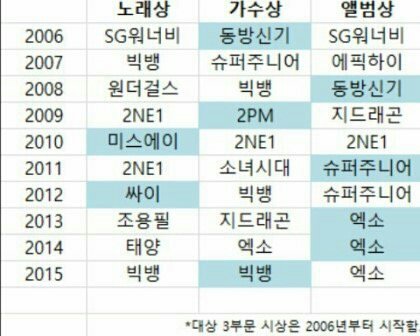 2006이후 조용퓔님 에수쥐원어비 빼면 다3대소속임. 아이돌은 싹다 3대ㅋㅋㅋㅋㅋㅋ 지금 관음중인 땅굴 있으면 보고가렴 ㅋㅋㅋㅋㅋ 근데 엑소쩐다 데뷔이후 대상놓친적 없네 역시 갓소