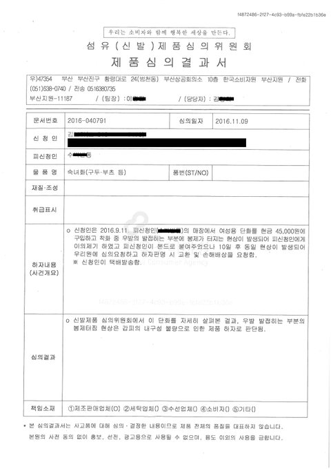 알아보니 [한국소비자원] 에서 신발과 의류 관련 불량판정 해주는 기관이 있어 의뢰함.