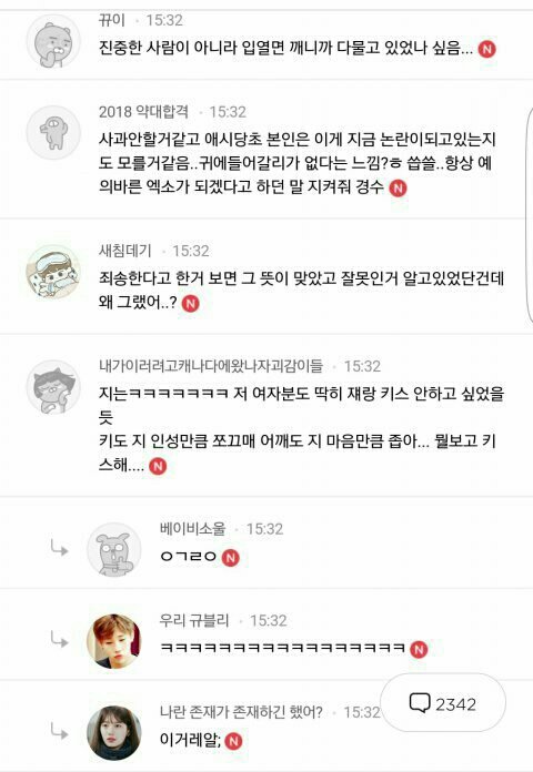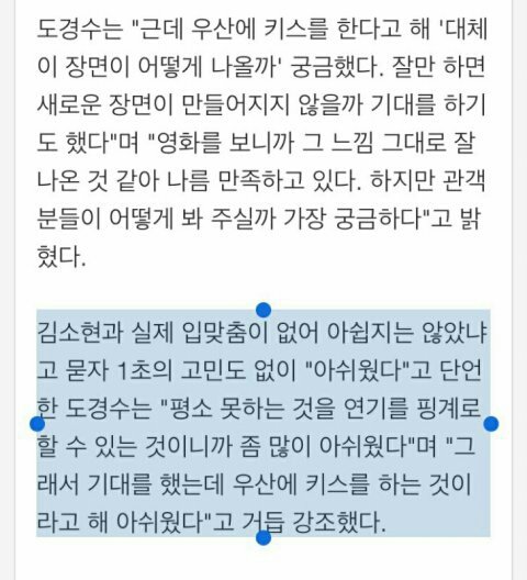 경수 의도 멋대로 해석해서 올리는건 너네지ㅋㅋㅋㅋ 경수는 원래부터 키스신 찍는거 어렵다고 했고 김소현 그 기사도 경수는 우산에다가 하는게 더 좋을 것 같다고 결정해서 안 아쉽다고 했는데 저따구로 난거고ㅋㅋㅋㅋㅋㅋㅋ 그리고 형 영화에서 그 키스신은 달달하고 그런 장면이 아니고 좀 그런 장면이었음 실제로 안 한게 다행이라고 생각할 수 있지 게다가 경수는 그 장면을 같이 찍은 상대 배우의 외모에 대한 얘기를 한 적이 없음 그런데도 이런 글을 올리는건 오히려 이 글을 올린 니가 니 멋대로 배우 외모를 판단해서 올리는거 아니냐?