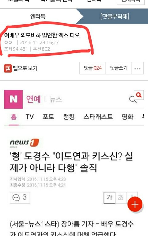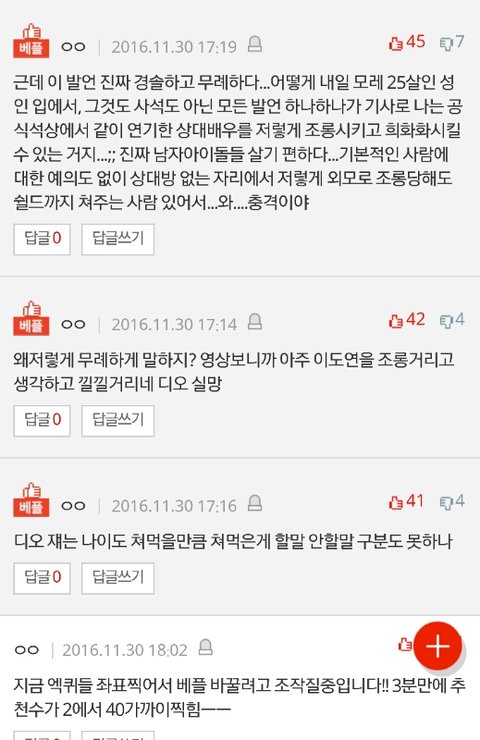 엑소팬들이 여배우 외보비하하고 조롱한 디오를 쉴드치고자 베플조작하는거 실시간으로 봤다