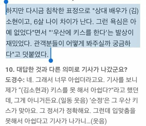 (소현이 인터뷰요) 도경수가 소현이가 너무 어리니 키스는 안하는게 좋지않냐고 대표님께 제안했다고 합니다.