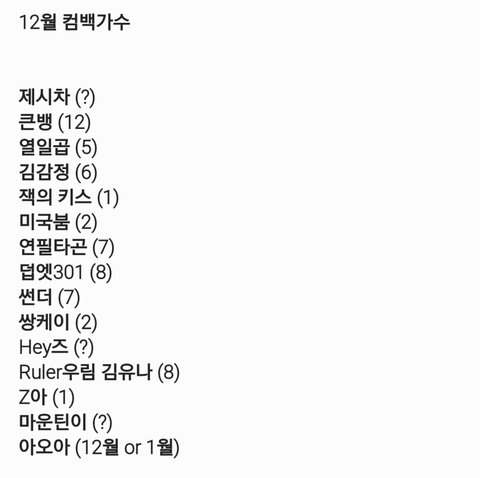 12월 컴백 가수
