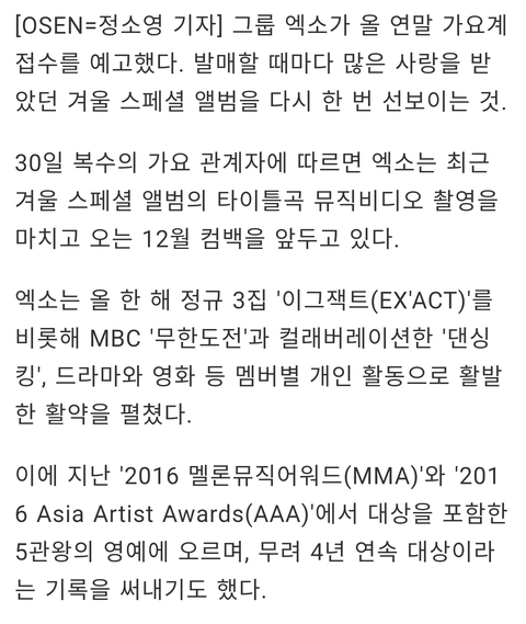 엑소, 12월 겨울 스페셜로 돌아온다.."뮤비 촬영 완료"