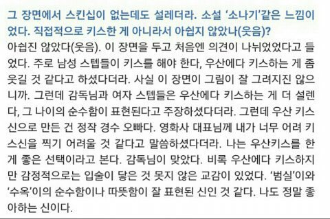 똑같이 키스신이 어려웠다 한 인터뷰인데 단지 상대 여배우 외모 가지고 그랬다고 착각하고 물어 뜯고 있는 사람들은 다른 인터뷰를 보지도 않고 자기들끼리 해석하고 있는데,그 사람들이 상대 여배우 외모를 비하한거임