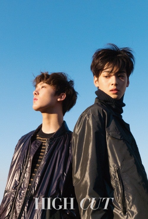 아스트로는 12월 1일 발간된 매거진 ‘하이컷’을 통해 자체발광 패션 화보를 공개했따. 반짝이는 소재의 점퍼나 줄무늬 톱을 단복처럼 입고 구름 한 점 없는 하늘과 짙푸른 세트를 배경으로 신비로운 눈빛 연기를 선보였다. 무대에서 보여주던 귀여운 모습과는 다른 성숙하고 차분한 매력이 느껴진다.