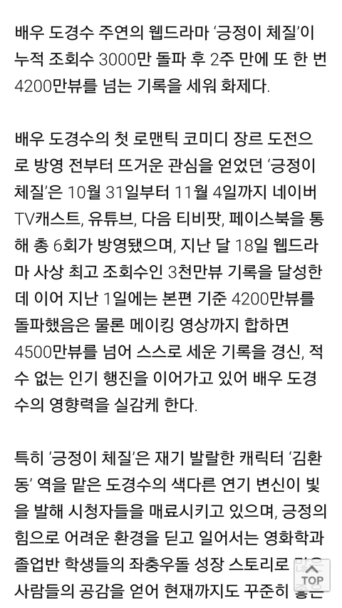 도경수 주연 웹드라마 ‘긍정이 체질’, 4천2백만 돌파