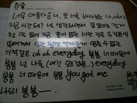 나는 일단 이렇게 들렸는데 내가 못들은 부분이나 다르게 들렸으면 알려주라!! +급하게 써서 악필이야...봐주라 (찡긋-★ ++저기 모르겠다고 한 부분 hit me래!!