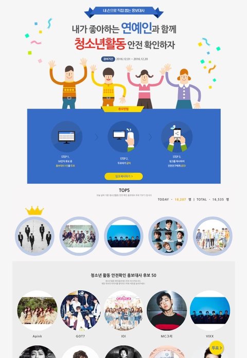 여긴 아직 잘안알려진것같네!! 우리 청소년..안전이였나 그 홍보대사 후보에있어! TOP 5에 들어있어 우리 잉톡이들도 투표하면 일등먹을지도몰라!! 우리 이미지랑 진짜 잘맞는것 같아서 꼭 우리가 했으면좋겠어!