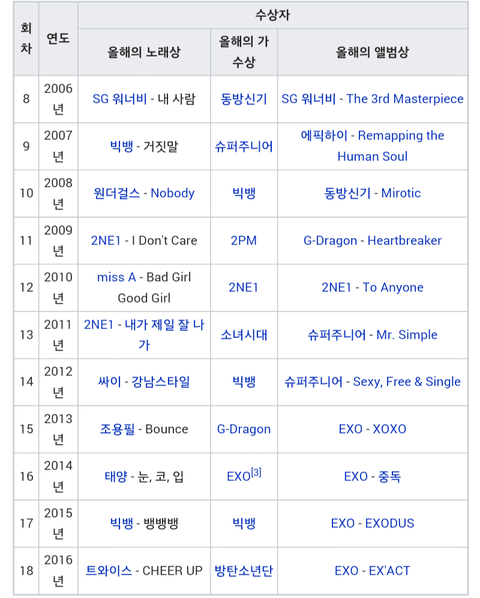 가수상 뿐만 아니라 맘마 지난 10년간 대상탄 가수들 봐라ㅋㅋㅋㅋㅋㅋ