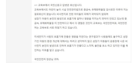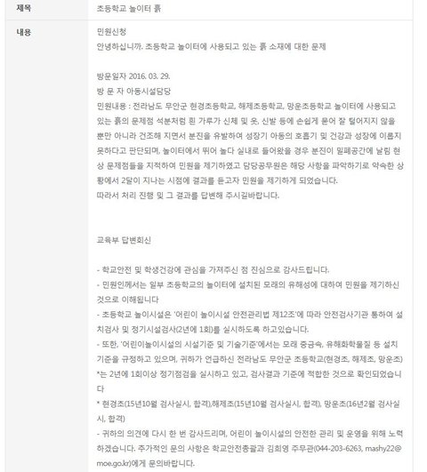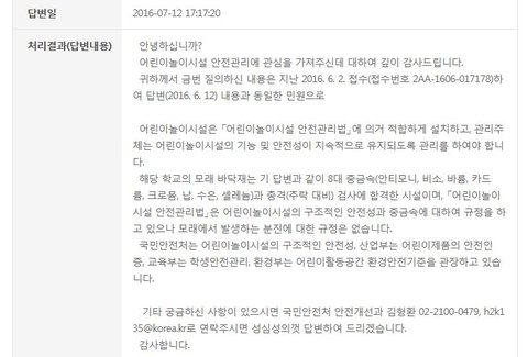 아이들의 안전과 건강이 직결하는 건데.. 학생들의 안전과 생명을 지켜줘야 하는 교육부나 국민안전처에서 직접 현장조사도 안 해보고 종결지으니 정말 속상하고 화가나더라구요..