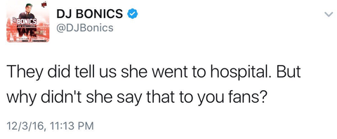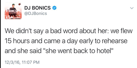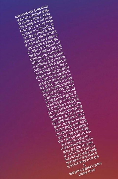 "그녀는 전날 밤에 병원에 가야만 한다고 했다. 연습은 했어요. 나보다 다른 무대에 서 달라고 요청함."