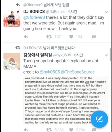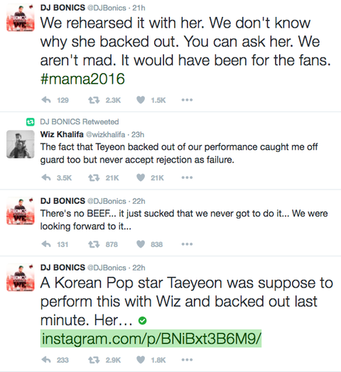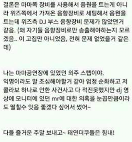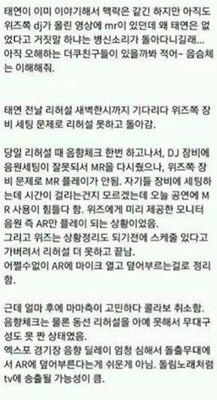 4. 몇시간 뒤 태연이가 길고 디테일 있게 상황을 설명해줌. (충분히 억울한 상황인데 마마, 위즈칼리파, 디제이측 다 생각해주며 해명글 써주는 태연이...)
