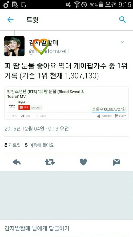 케이팝 중 피땀눈물이 좋아요 1위래