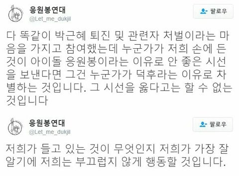 응원봉 연대에 참여하는 팬들을 보며 이젠 아이돌 팬 혹은 덕후라는 이유로 욕 먹을 이유는 없다고 봅니다.
