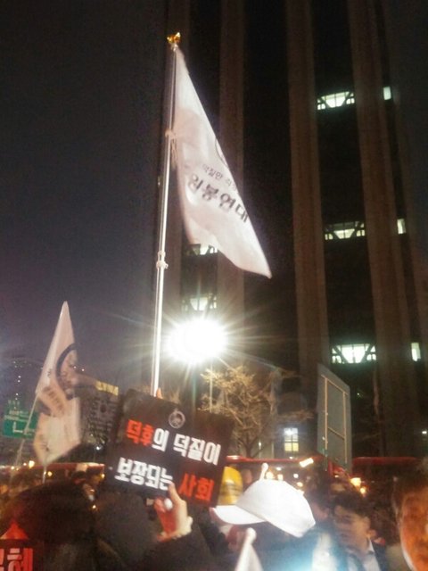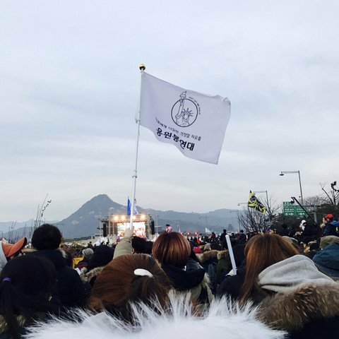 이렇게 깃발을 들고 트x터 라는 sns 계정에 공지를 올려 응원봉을 든 사람들끼리 모여 집회에 참여 하였습니다.