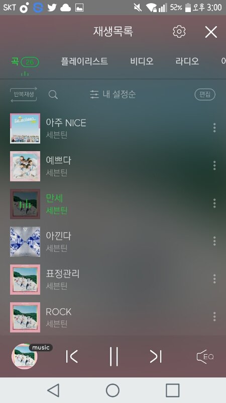 이게 이번 트랙리스트~ 한시간에 한번 집계 되니까 편하게 할려면 한곡당 3분이라고 치면 총 19곡을 저렇게 반복해서 재생목록에 넣어줘!