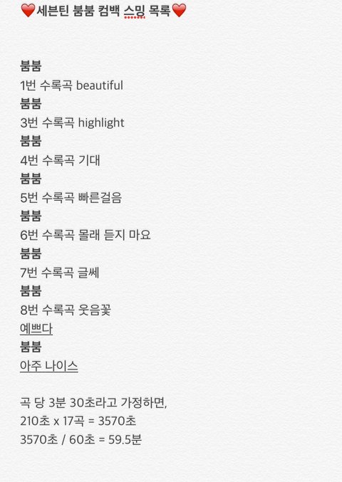 다음은 스밍 목록입니다. 가장 중요해요. 꼭 스밍 목록 다음과 같이 해주시고, 총 한시간 리스트니까 반복재생 버튼 눌러 주시면 됩니다^^