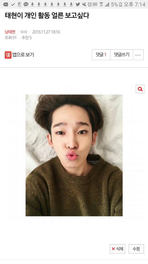 니들끼리 갤가서 놀든 팬톡가서 놀든 알빠아니고 탈퇴 후 ㄴㅌㅎ 팬톡 살리려고 젤 먼저 글 쓰고 노력했던 내가 ㅂㅅ이다 알아서 잘 놀아^ 다신 오지말고