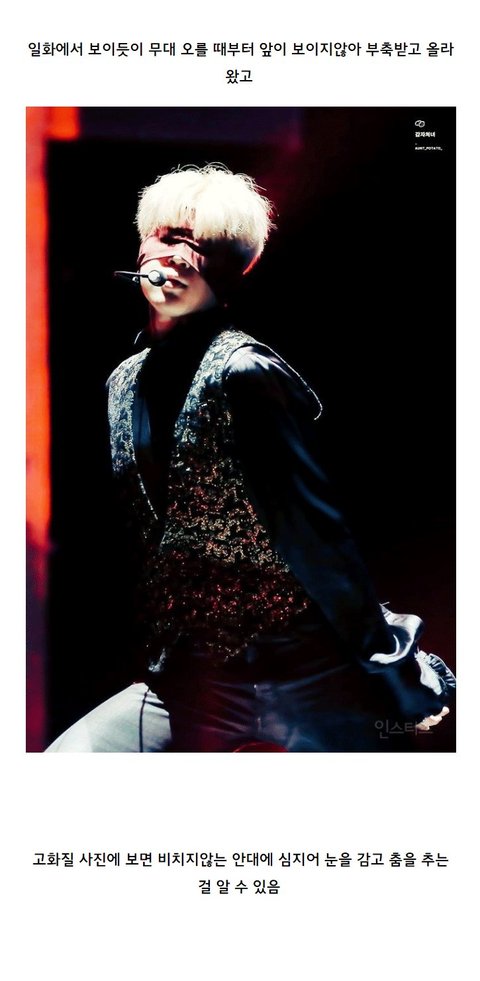 얘가 노력파라고? 노력을 그만큼 많이 한다는 거겠지만 실용무용과 졸업한 사람으로써 균형감각도 균형감각이지만 세밀한 동작 같은거 표현하는 능력이 재능 없이는 나오지못할 춤선임. 눈가리고 춤추는 것도 전문적으로 하시는 분들이 있는데 눈을 가린다는 것 자체가 안보이는게 문제가 아니라 착지를 할때는 한곳에 초점을 두는게 중요함. 그런데 눈을 완전히 가린 상태로 턴을 하고 뒤로 매끄럽게 구를 슈 있는애가 아이돌을 하고있다는게 신기하다. 진짜 잘하나보네