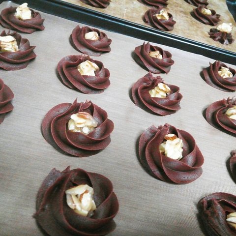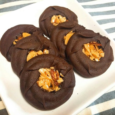 이건 '로미아스'쿠키인데요, 아몬드누가를 토핑한 초코버터링쿠키에요!^^ 초코랑 아몬드가 최강조합인지라 엄청 맛있게 먹었던 기억이!!